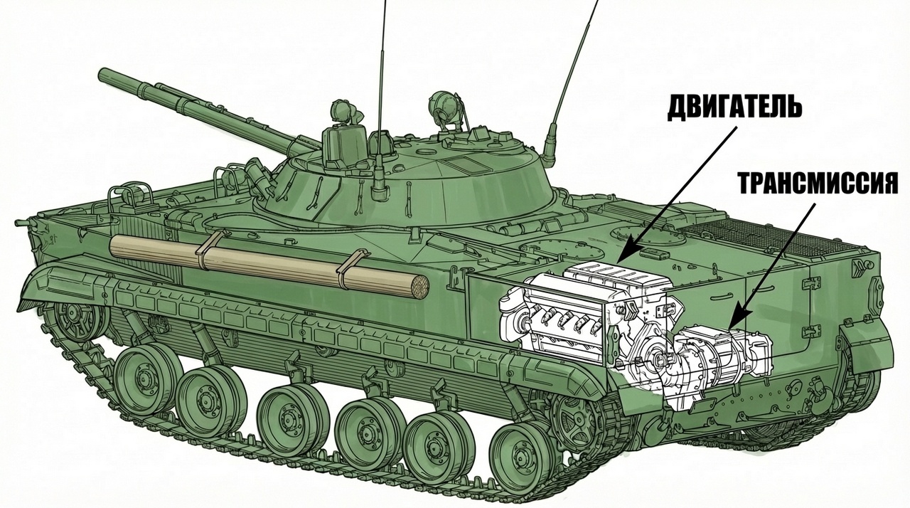 На Курганском машиностроительном заводе из фанеры изготовили 2 макета кормовой части будущей «тройки» в различных вариантах - с поперечным и с продольным расположением двигателя. Комиссия под председательством представителя НТК ГБТУ полковника Петра Кириченко рассмотрела оба варианта - с точки зрения удобства входа-выхода и размещения десанта. В конечном итоге она утвердила вариант с поперечным расположением двигателя, обеспечивающий лучшее размещение десанта. Такое МТО получилось самое короткое - всего 1200 мм.