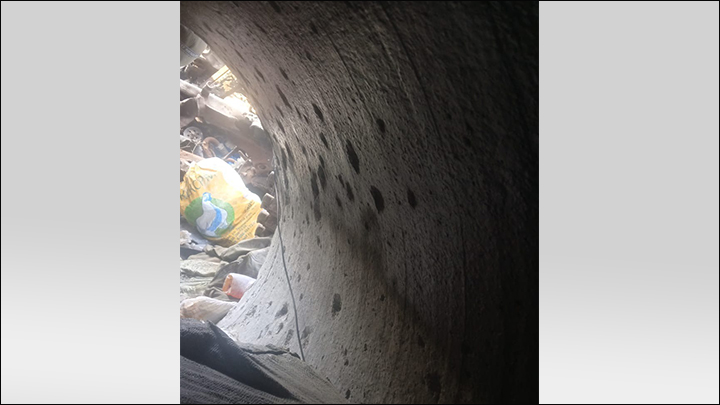 Вход в трубу, посечённый осколками. Фото предоставлено Сергеем Серезлеевым