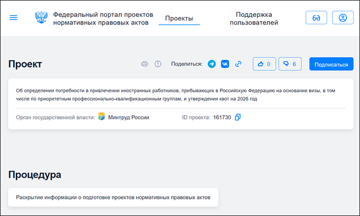 К завозу мигрантов готовы. Фото: скрин официального сайта Федерального портала проектов нормативно-правовых актов