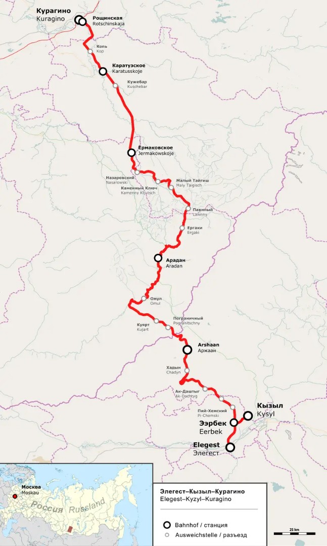 Отметим, что итоговой точкой маршрута (помимо Кызыла) должно было стать Элегестское месторождение. Объем грузовых перевозок по железнодорожной линии Курагино – Кызыл должен был достичь 12 миллионов тонн в год. Суммарная же протяженность новой магистрали, если верить официальным источникам, составит 411,7 километра. Инвестиции в реализацию данного проекта, по информации на 2012 год, оценивались в 133,1 миллиона рублей.