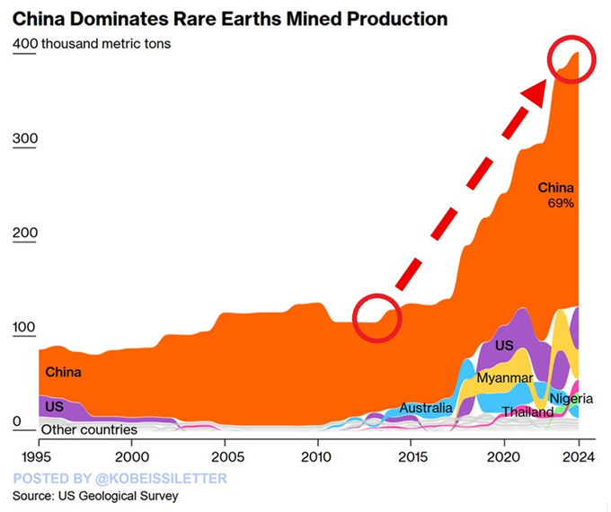 Импорт редкоземов в США из КНР (сперва через Гонконг, Макао и/или Сингапур) был налажен со второй половины 1970 годов при Дэн Сяопине, являясь одним из отражений двустороннего сближения, в немалой степени – на антисоветской основе («челночная дипломатия» Генри Киссинджера). Начиная с 1980-х годов и ускоряя темпы развития в 1990 и 2000 годах, китайские власти, используя конкурентные преимущества (в том числе централизованную систему государственного управления), сделали осознанный выбор в пользу крупных инвестиций в добычу и переработку. Китайские возможности добычи и переработки редкозёмов привлекали и западных партнёров, что со временем привело к закрытию многих карьеров и перерабатывающих предприятий в США и других странах «мирового Запада». Даже если редкоземельные металлы добывались где-нибудь в Калифорнии или Австралии, руда для переработки и обогащения всё равно отправлялась в Китай с его менее жёсткими экологическими требованиями для подобного рода производств. К началу 2020 годов на долю этой страны приходилось до 60 процентов мировой добычи редкоземельных металлов и по отдельным элементам – почти 100 процентов переработки и производства готового металла.