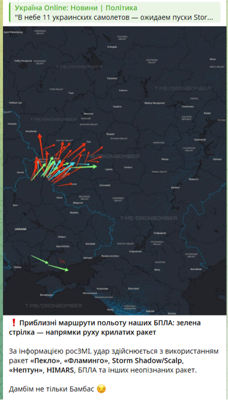 «21. 10.25. 17.10: «Приблизні маршрути польоту наших БПЛА: зелена стрілка — напрямки руху крилатих ракетЗа інформацією росЗМІ, удар здійснюється з використанням ракет «Пекло», «Фламинго», Storm Shadow/Scalp, «Нептун», HIMARS, БПЛА та інших неопізнаних ракет.Дамбім не тільки Бамбас»
