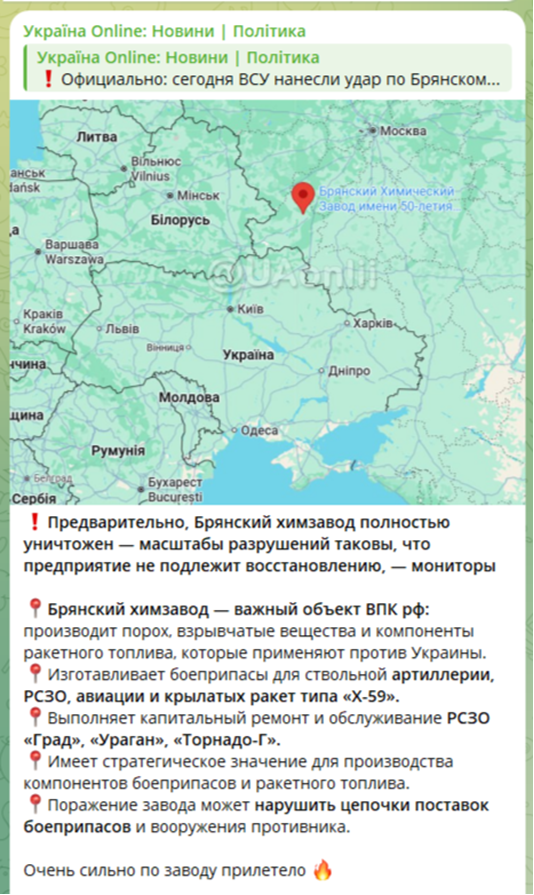 «21.10.25, 22.46: Официально: сегодня ВСУ нанесли удар по Брянскому химзаводу ракетами, среди которых — Storm Shadow, успешно преодолевшими российскую ПВО, — Генштаб»
