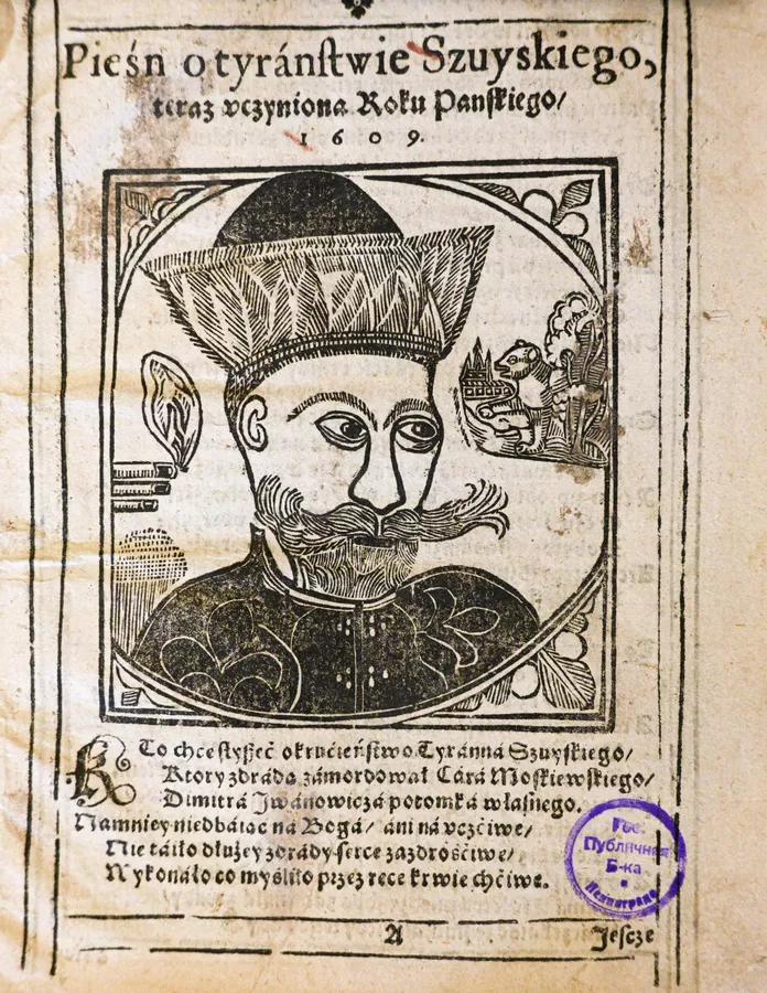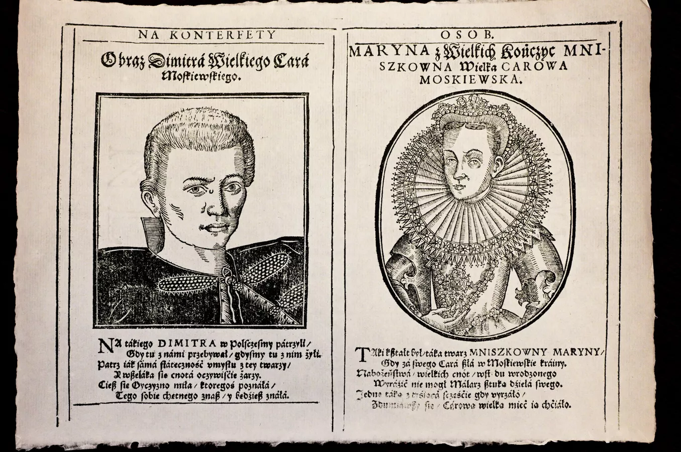 Слева направо: "Песнь о злодействах Шуйского, учиненных в нынешнем 1609 году"; портреты Лжедмитрия I и Марины Мнишек из издания "Песнь на всерадостное торжество объединения двух народов, польского и московского" (Краков, 1606 год).