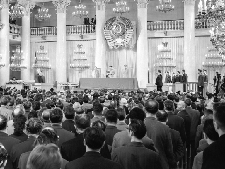 На фото: председатель Военной коллегии Верховного суда СССР Виктор Валерьянович Борисоглебский (в центре на дальнем плане) во время оглашения приговора в Колонном зале Дома союзов на открытом судебном заседании Военной коллегии Верховного суда СССР по делу американского летчика Френсиса Гарри Пауэрса, обвиняемого в шпионаже против СССР, 1960 год. (Фото: Владимир Савостьянов/ТАСС)