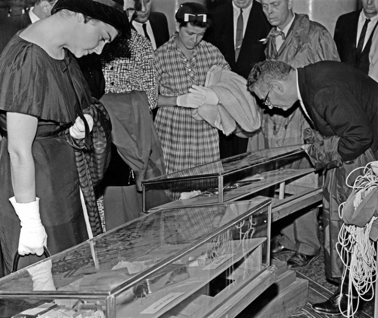 На фото: открытое заседание военной коллегии Верховного суда СССР по уголовному делу американского шпиона Френсиса Гарри Пауэрса в Колонном зале Дома союзов. Члены семьи Пауэрса осматривают вещественные доказательства по делу, выставленные в зале заседаний, 1960 год. (Фото: Савостьянов Владимир, Стужин Алексей/ТАСС)