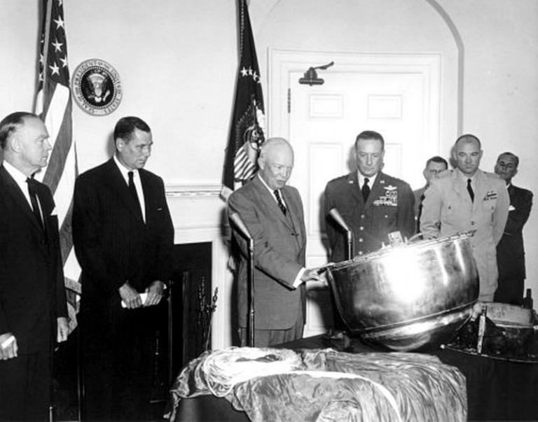 На фото: президент США Дуайт Эйзенхауэр осматривает капсулу с Discover 13, 15 августа 1960 года. (Фото: eisenhowerlibrary.gov)