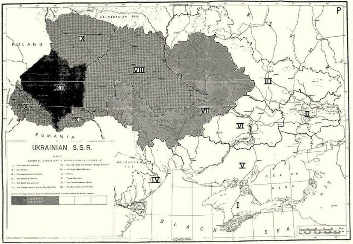 В подготовленном в августе 1957 г. ЦРУ докладе "Факторы сопротивления и зоны действий специальных войск США. Украина" территория советской республики была поделена на 12 зон. По мнению аналитиков, с точки зрения "исторических особенностей, религиозной предпочтительности и вероисповеданий", Крым (зона 1), Донбасс (зона 2), северо-восточный район Украины (зона 3) являются "русскими островами в украинском море и, следовательно, отождествляют себя с российскими интересами и советской властью".18