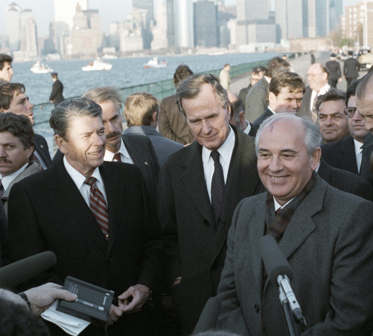 Генеральный секретарь ЦК КПСС Михаил Горбачёв, президент США Рональд Рейган и вице-президент США Джордж Буш дают интервью на улице Нью-Йорка во время визита Горбачёва в США РИА Новости © Юрий Абрамочкин