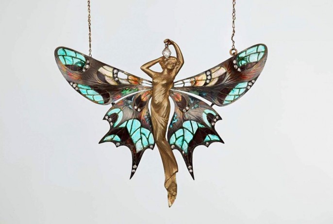 Ювелир и дизайнер Рене Лалик известен по сию пору. Он – визитная карточка ар-нуво. Динамичные стрекозы и фантастические цветы, скарабеи, горгульи, эффектные бабочки, змейки, тонкие девы с развевающимися волосами – эти образы, точно сошедшие со страниц легенд и сказок, были оригинальны. Серебряный век требовал от всех яркой нетривиальности. Кого волнует простецкая роза? Ей надобны шипы и чёрная окантовка. На выставке есть характерная вещь Лалика – бабочка с телом женщины, причём это «насекомое» выглядит хищным и алчущим. Даже концы крылышек – острые. Типичный вариант фамм-фаталь – томное обаяние и плотоядность, слитые воедино.