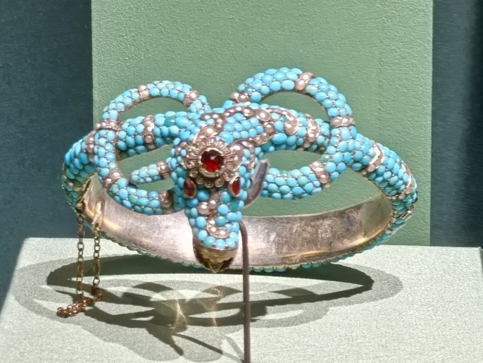 Бирюза – совсем иные флюиды. Она и простовата, и надменна – смотря, как её подать. Бывает она и опасной. «Девушке нельзя дарить бирюзы, потому что бирюза, по понятиям персов, есть кости людей, умерших от любви, а замужним дамам нельзя дарить аметиста», - говорится у Николая Лескова в рассказе «Жемчужное ожерелье». Тем не менее, бирюза слыла «девичьим» камешком, так как идеально сочеталась со свежестью барышень. Перед нами – бирюзовые браслеты, броши – в виде цветов и птиц, длинные серьги. А если всё это в сочетании с голубыми глазами, которые тогда встречались чаще, нежели теперь? «Казалося, для нежной страсти / Она родилась. А глаза… / Ну, что такое бирюза?» - вопрошал Михаил Лермонтов, расписывая тамбовскую казначейшу.