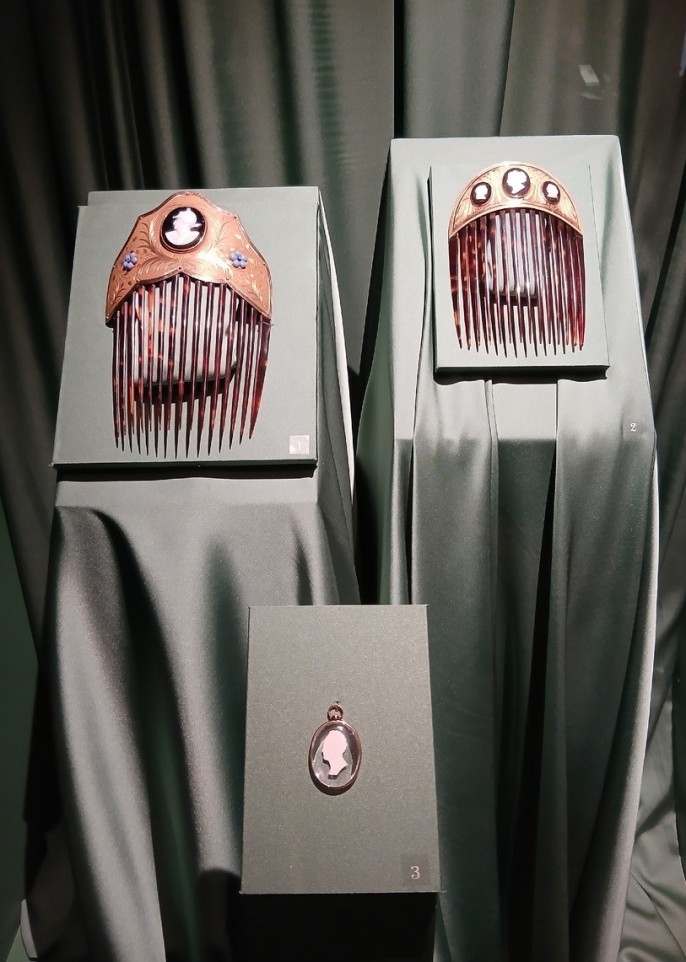 Дивные вещи – свидетельства эпох. Камеи, широко представленные на выставке, сделались популярными в самом конце XVIII столетия, когда началось увлечение древностями, а женские наряды стали похожи на одеяния греко-римских богинь. На протяжении всего следующего века мода на камеи то проходила, то возникала вновь. «Подобного профиля и очертанья лица трудно было где-нибудь отыскать, разве только на античных камеях», - в этой гоголевской фразе – утончённый восторг. На выставке есть и одиночные камеи-броши, и серьги, и массивные ожерелья из камей. На экспозиционных витринах – камеи с изображением Екатерины Великой, Александра I, Иоганна Вольфганга фон Гёте. Также камеями украшались гребни, использовавшиеся дамами для причёсок a-la grecque. На выставке можно увидеть подобные изделия, как отечественного, так и французского производства.