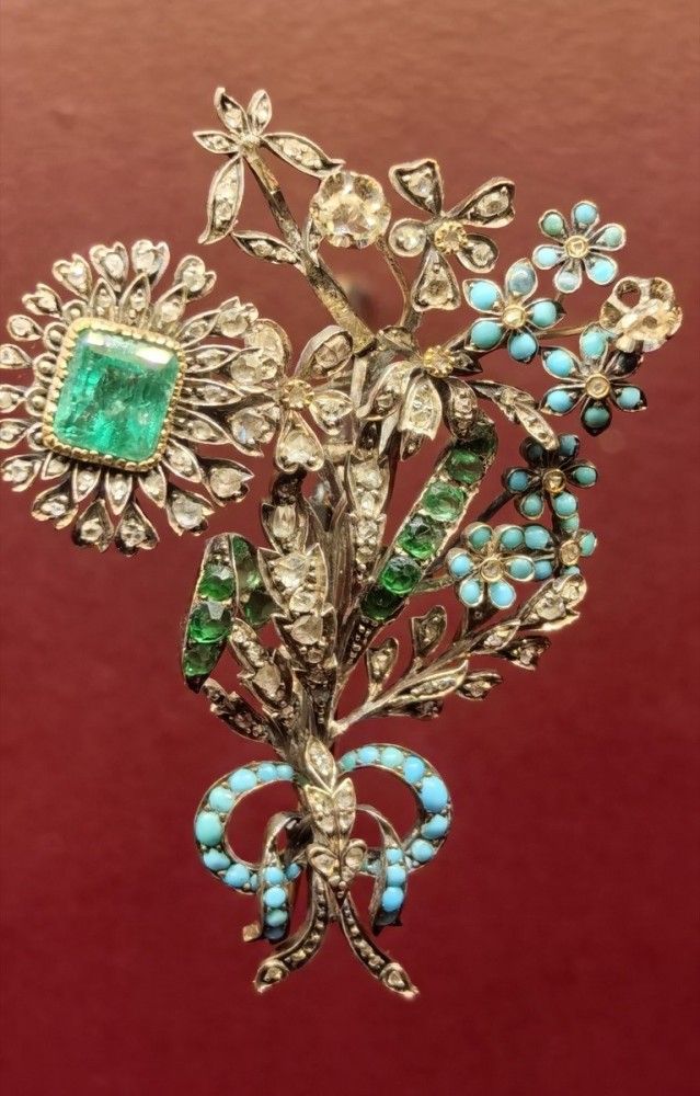 Когда-то принаряженные красотки дополняли свои облачения букетами, составленными из блестящих каменьев. Корсажный букетик притягивал взоры – иногда нескромные, ибо эти сверкающие соцветья располагались рядом с декольте. На выставке имеются и такие экземпляры. Вот – умопомрачительный букетик, в котором идеально звучат серебро, золото, бриллиант, алмазы, изумруд, бирюза и – немного стекла. Какую прелестницу он радовал? Сколько заплатил за эту феерию супруг? Это важно только дотошным историкам. Нам же – пиршество для глаз.