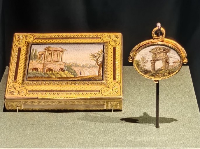 Представлены табакерки, оформленные микромозаикой. Это было необычное искусство, примыкавшее к ювелирному мастерству, а иногда считавшееся одним из его направлений. Картинка, весьма сложная и причудливая, формировалась из мелких кусочков смальты. Родина микромозаики – Ватикан, а в России она получила распространение в XIX веке. Посетив Ватикан, император Николай I оказался под таким впечатлением от увиденных диковин, что повелел открыть в Петербурге мастерскую, куда приглашали итальянских мозаичистов. Затем появились и русские умельцы.