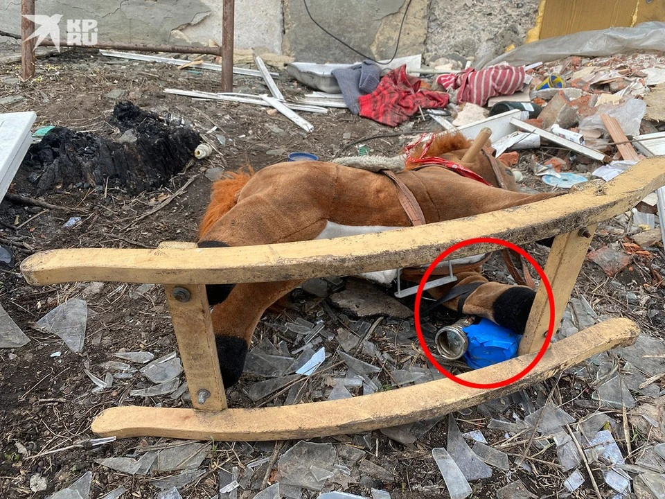 - Плюшевый конь-качалка, очень бодрый, чистый, на деревянных полозьях. На одном – половина старого, советского фонарика из алюминия, две тротиловые шашки, детонатор и запал от гранаты. Все примотано синей изолентой. Леска к батарее. Сам конь стоял миной к стене, сразу и не увидишь «сюрприз».