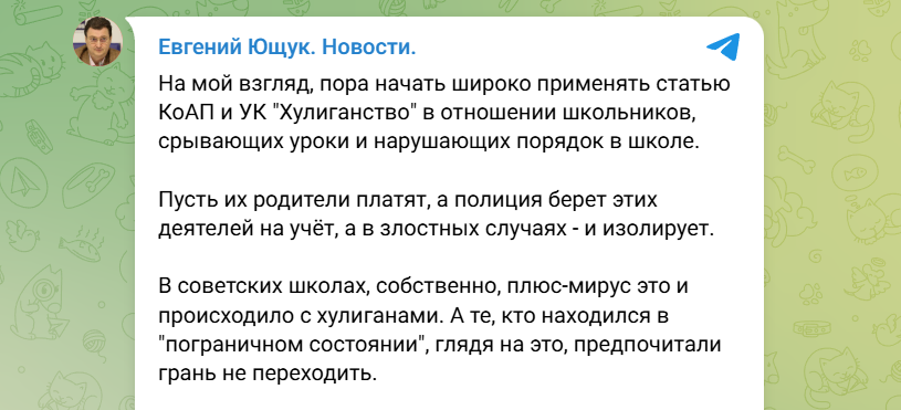 Ранее специалист по конкурентной разведке и аналитик информационных источников Евгений Ющук предложил в своём телеграм-канале начать применять в отношении школьников статью "Хулиганство" за срыв уроков и нарушение порядка в школе.