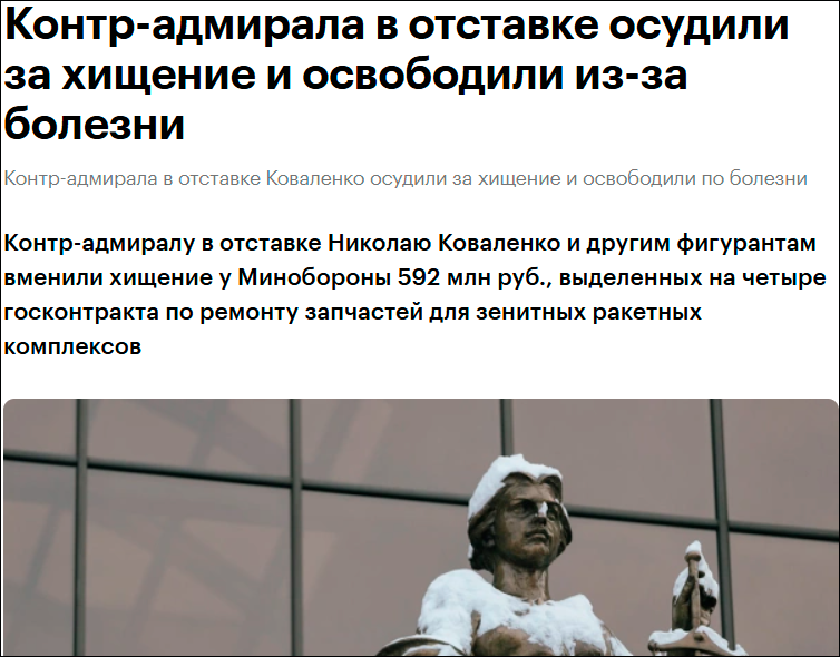 Апофеозом стало дело контр-адмирала в отставке Николая Коваленко. В середине февраля 2026 года Московский гарнизонный военный суд вынес ему приговор по делу о мошенничестве в размере 592 млн рублей. Суд назначил ему четыре года и шесть месяцев колонии общего режима и штраф в размере 500 тысяч рублей… и постановил освободить его от лишения свободы – "в связи с тяжёлым состоянием здоровья".