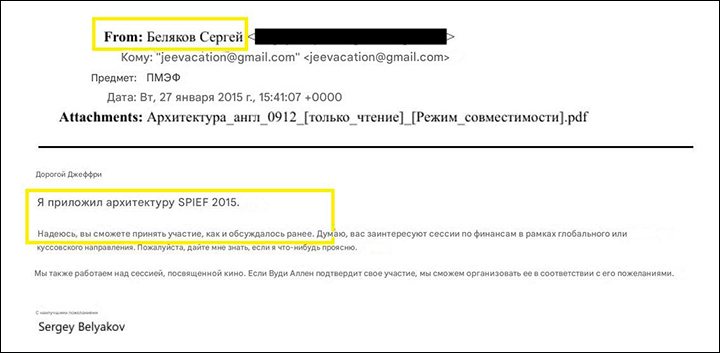 В январе 2015-го Беляков списывался с Джеффри Эпштейном по поводу подготовки Петербургского международного экономического форума и форума "Открытые инновации".