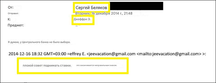 Это не единственное упоминание ведомства Эльвиры Набиуллиной (она возглавила Банк России 24 июня 2013-го) в переписке Белякова и Эпштейна. 16 декабря 2014-го Центробанк одним махом повысил ключевую ставку на 6,5 пункта – с 10,5% до 17%. Такой удар по экономике России удивил даже глобалиста-педофила, а вот Беляков принялся защищать давшую ему путёвку в "элиту" Набиуллину: