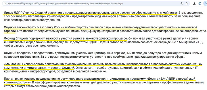 Второй факт – 22 января 2026 года на столичной площадке "Кибердром", принадлежащей АО "Сайберус", прошёл первый политический криптофорум "ЛДПР. Законодательное регулирование криптовалют и майнинга". Состоялся он под девизом "Мы за контроль, а не запреты", а спикеры от партии высказывались за то, чтобы государство возглавило "криптовалютное движение".