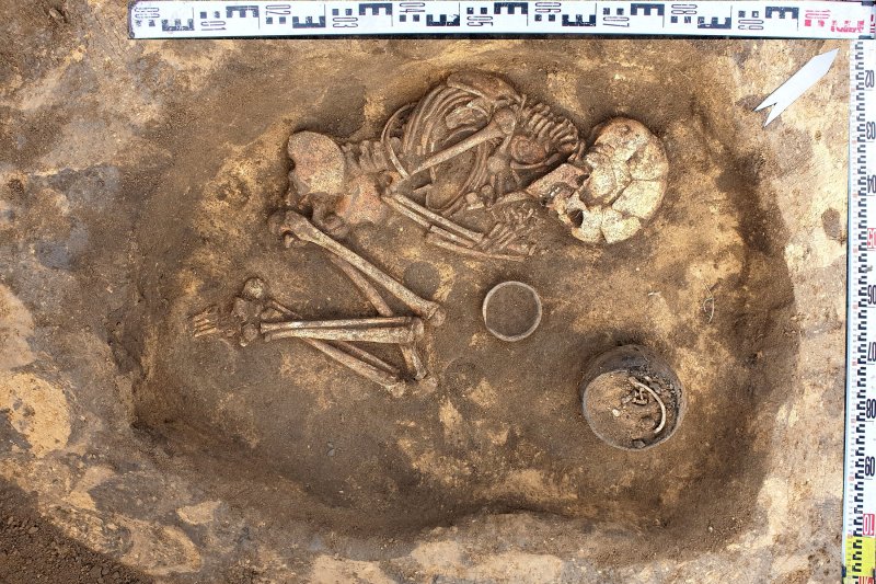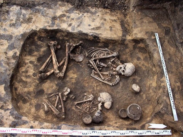 Рядом со скелетами нашли утварь, которая, по верованиям кочевников, должна была пригодиться им в загробном мире, в частности плоскодонные сосуды ручной лепки, в которых могла находиться ритуальная пища или питье.
