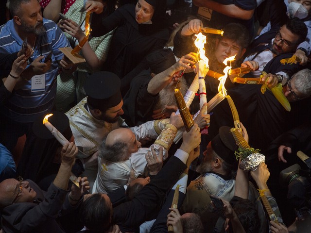 Паломники в храме Гроба Господня, где Иисус был распят, похоронен и воскрес из мертвых, держат свечи, толпясь на церемонии схождения, стараясь своими глазами увидеть чудо. Церемония каждый год транслируется по телевидению во многих странах мира.