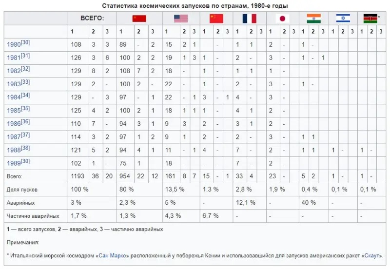 Вот незатейливая по содержанию таблица космических стартов 80-х годов прошлого века. У СССР – 80% всех стартов в мире.