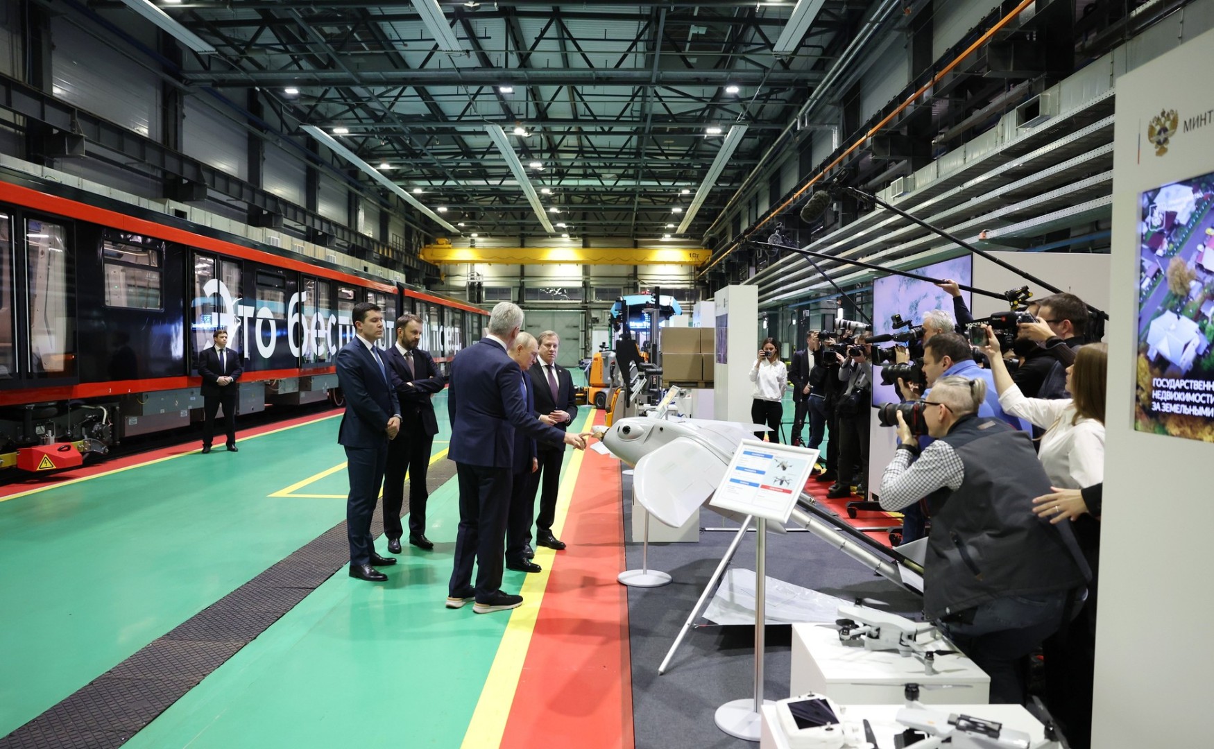 Перед началом совещания Владимир Путин осмотрел выставку о беспилотных технологиях, развёрнутую на площадке метродепо.
