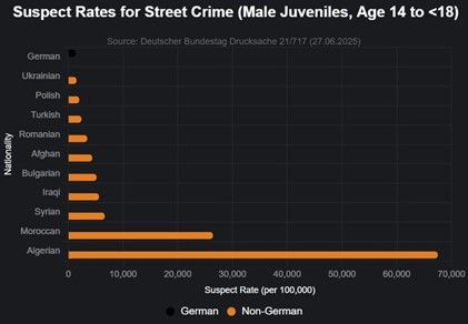 В немецких городах уже несколько лет очень сильны и постоянно нарастают антиправительственные настроения. В том же Магдебурге в 2023 году до 80 тыс. жителей провели ряд митингов против пронатовской политики властей, поставок оружия Украине и ограничении гражданских свобод. Власти бросают против подобного рода мирных демонстрантов полицию и силовиков, в то же время упорно не замечая стремительный рост мужской преступности среди молодёжи в Германии и ее связь с миграционной проблемой. А тем временем неполиткорректная статистика, несмотря на ее игнорирование, становится все более показательной: несовершеннолетние алжирские мигранты мужского пола чаще становятся подозреваемыми в уличной преступности, чем коренные немцы в 50,5 раза!